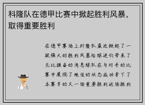科隆队在德甲比赛中掀起胜利风暴,取得重要胜利
